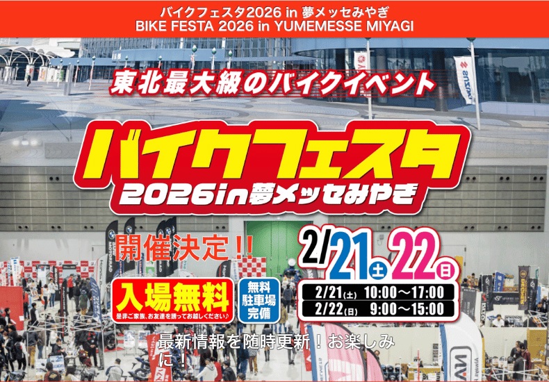 2月21日-22日は夢メッセみやぎにて『バイクフェスタ2026in夢メッセみやぎ』が開催されます。